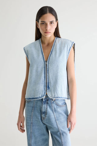 Jasje van het Belgisch merk Bellerose. 100% polyamide. Kleur: Combo A. Omkeerbaar, relaxed mouwloos jasje van gewassen lichtblauw denim met ritssluiting aan de voorkant, afgewerkte randen en rechte zoom. Aan de andere kant voorzien van een contrasterende gewatteerde voering met luipaardprint.