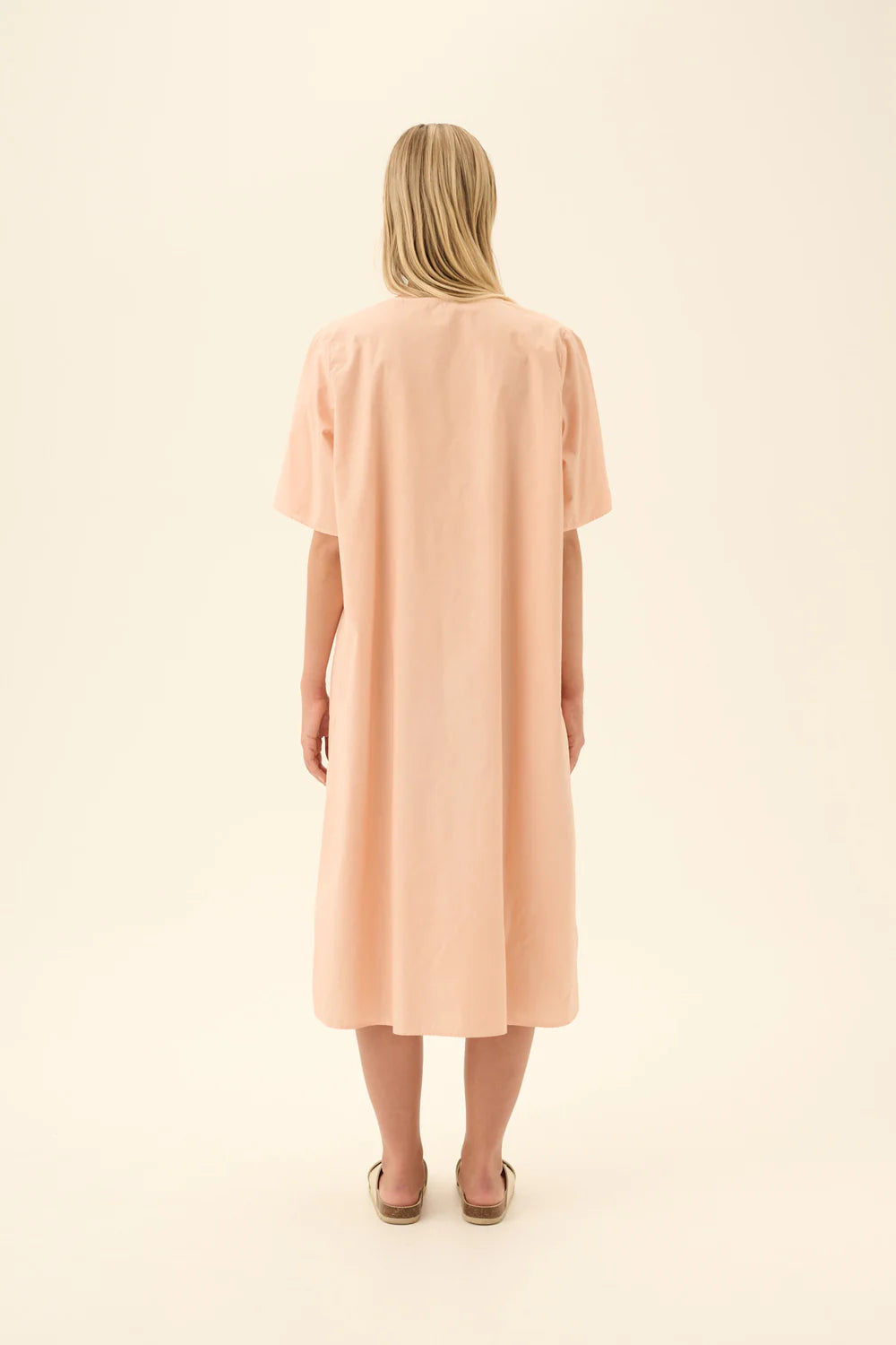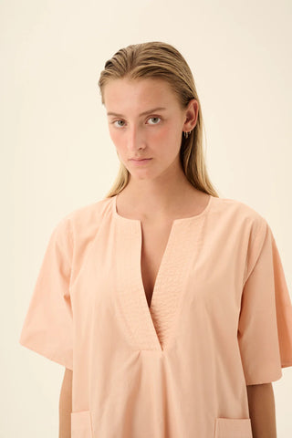 Jurk van het Deense merk Rue de Tokyo. 100% katoen. Kleur: Beige Rose. Jurk met A-lijn, korte mouwen en V-halslijn.