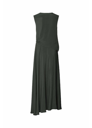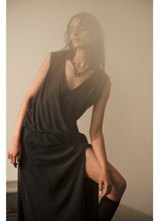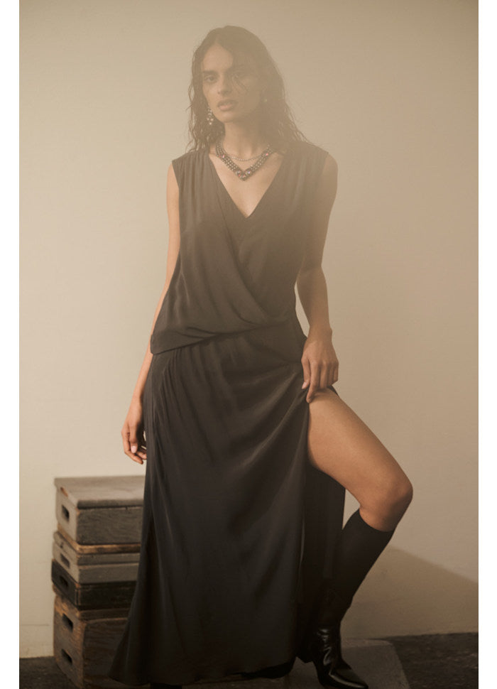Jurk van het Deense merk Rabens Saloner. 100% viscose. Kleur: Pirate Black. Gedrapeerde jurk zonder mouwen.