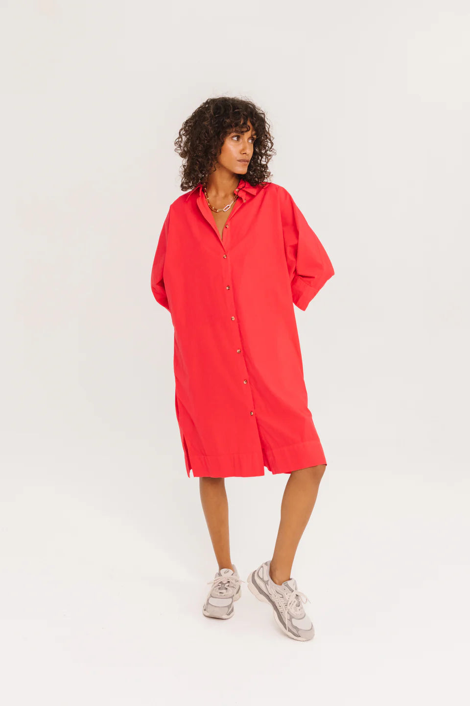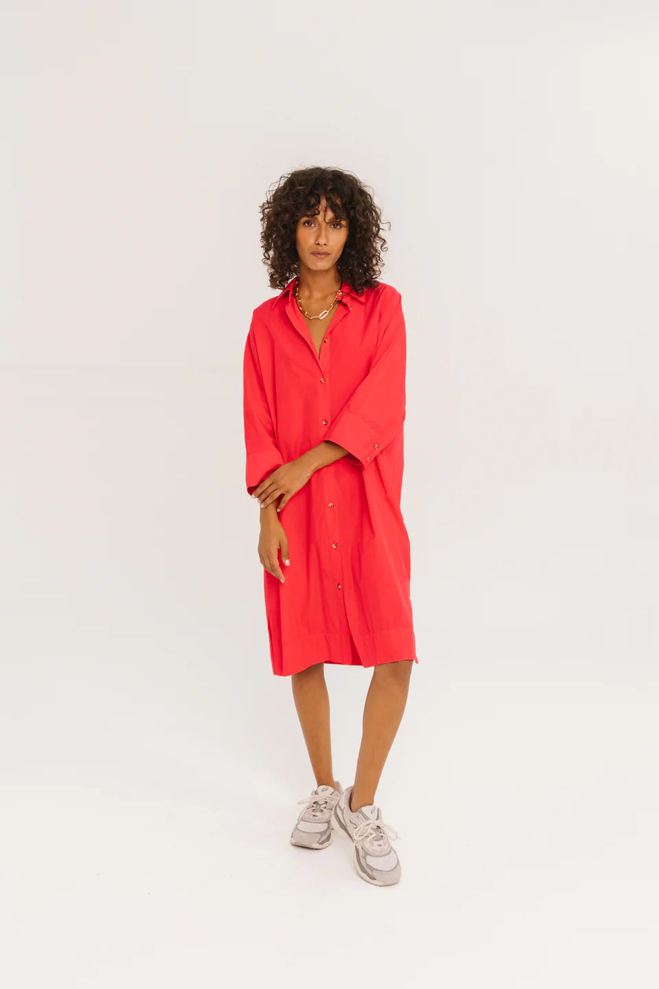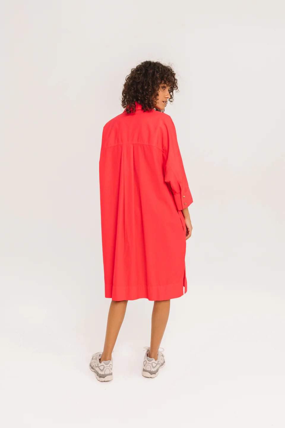 Jurk van het Franse merk Sacrécoeur. 100% katoen. Kleur: Cora. Effen midi-hemdjurk met 3/4 kimonomouwen. Overhemdkraag, plooi aan de achterkant en discrete zakken in de naden voor een strakke en vrouwelijke look.