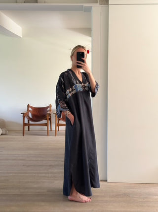 Jurk van het Belgische merk Mel Antwerp. 100% zijde. Kleur: Ink. Zijden jurk met tye dye printen V-hals.