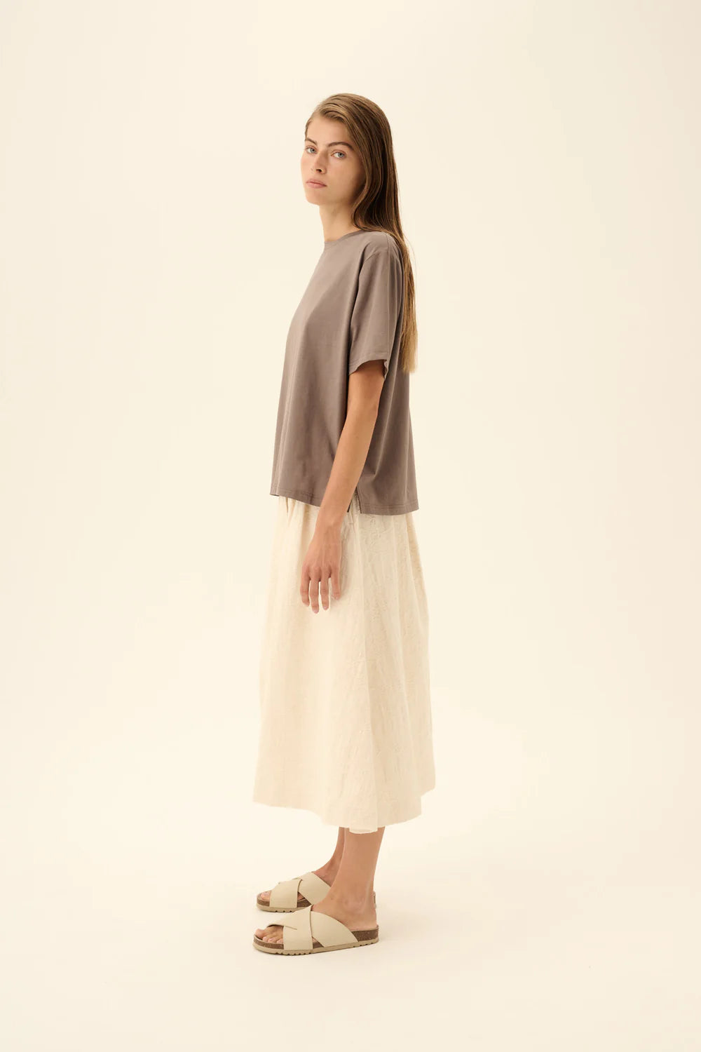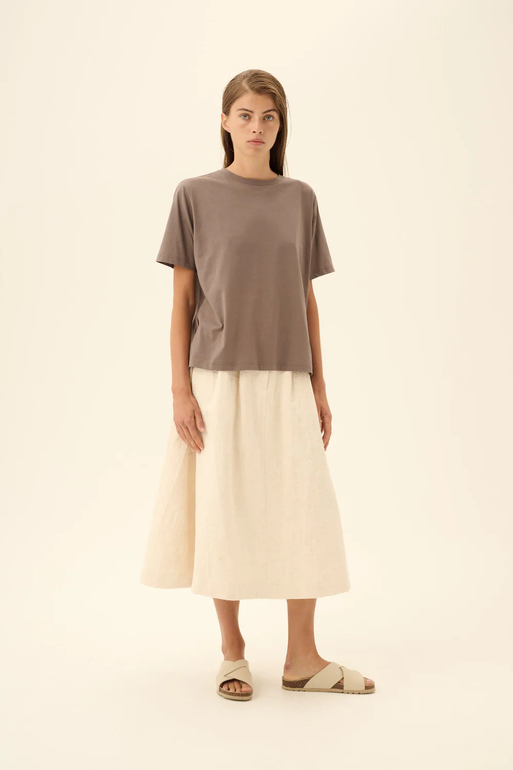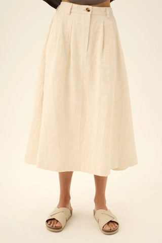 Rok van het Deense merk Rue de Tokyo. 100% katoen. Kleur: Eggshell. A-lijn rok met een stijlvolle geplooide voorkant.