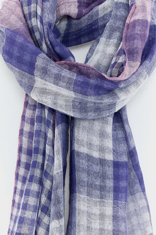 Sjaal van het Belgische merk Bellerose. 100% wol. Kleur: Check E. Geweven wollen sjaal in lila en wit ruitjespatroon met zachte paarse accenten, afgewerkt met franjes aan de randen.