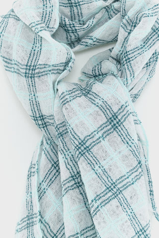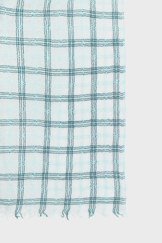 Sjaal van het Belgische merk Bellerose. 100% wol. Kleur: Check A. Geweven wollen sjaal in ruitjespatroon met zachte groene accenten, afgewerkt met franjes aan de randen.