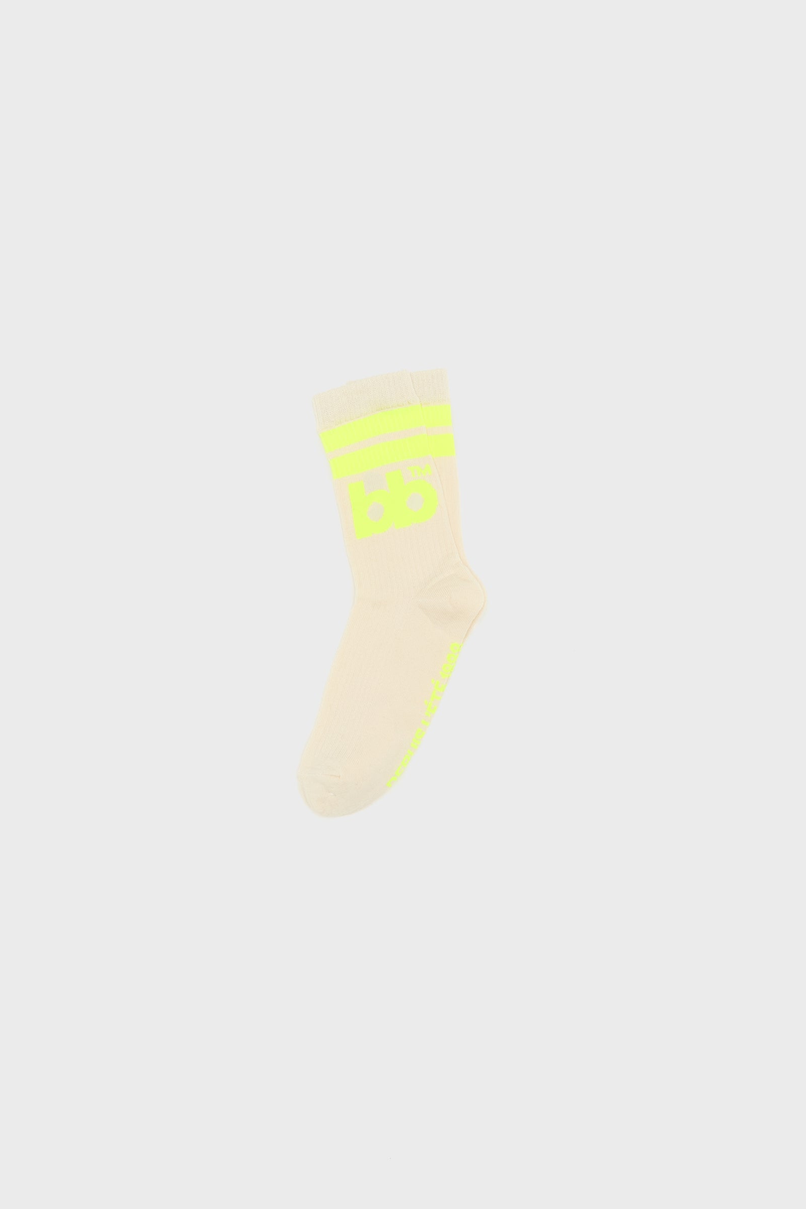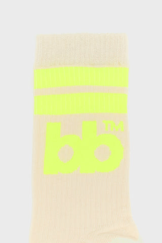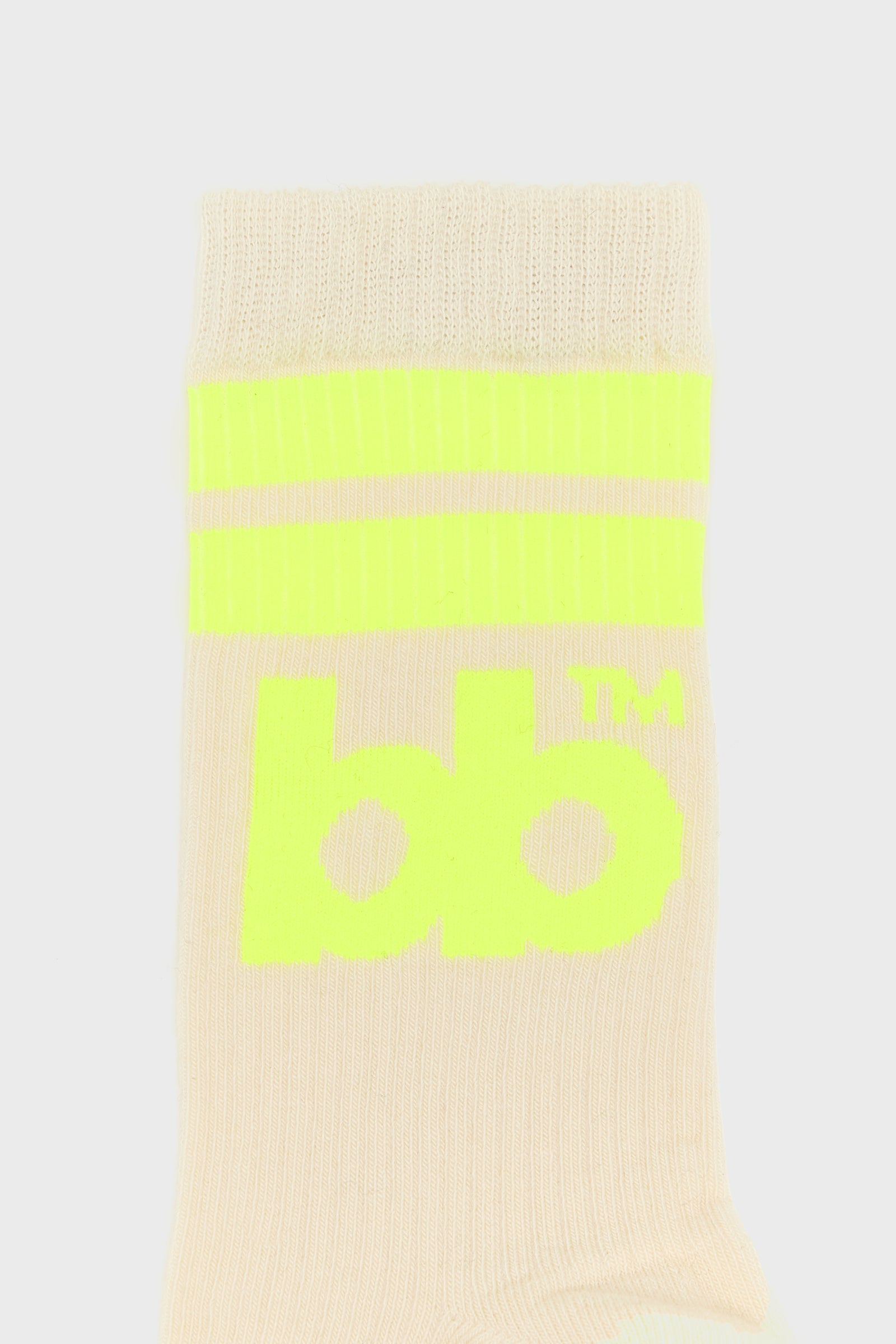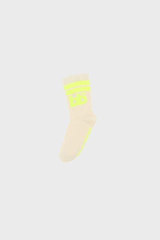 Sokken van het Belgische merk Bellerose.70% katoen, 27% polyamide, 3% elastaan. Kleur: Swan. Middenzware geribde sokken in ivoorwit met fluorescerende gele strepen en het Bellerose-logo op de enkel en zool.
