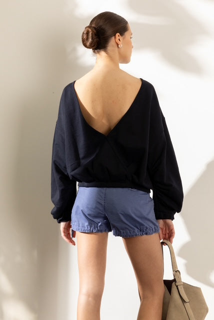 Sweatshirt van het Belgische merk Mel. 100% katoen. Kleur: Nuit. Omkeerbaar sweatshirt met diepe V.