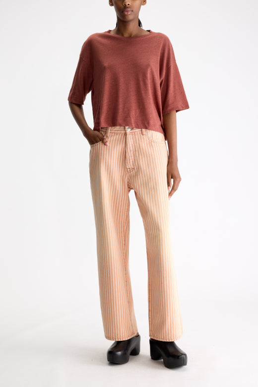 T-shirt van het Belgische merk Bellerose. 50% katoen, 50% linnen. Kleur: Mahogany. Wijde t-shirt in een luchtige linnenmix.