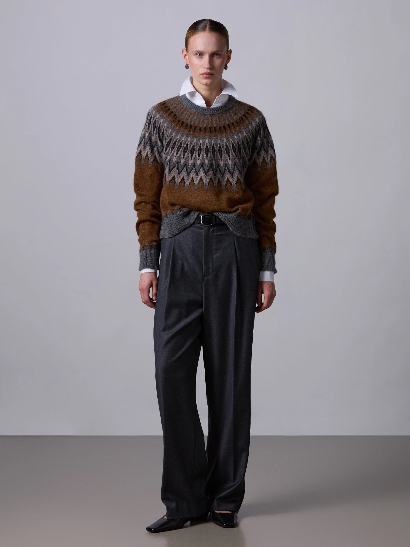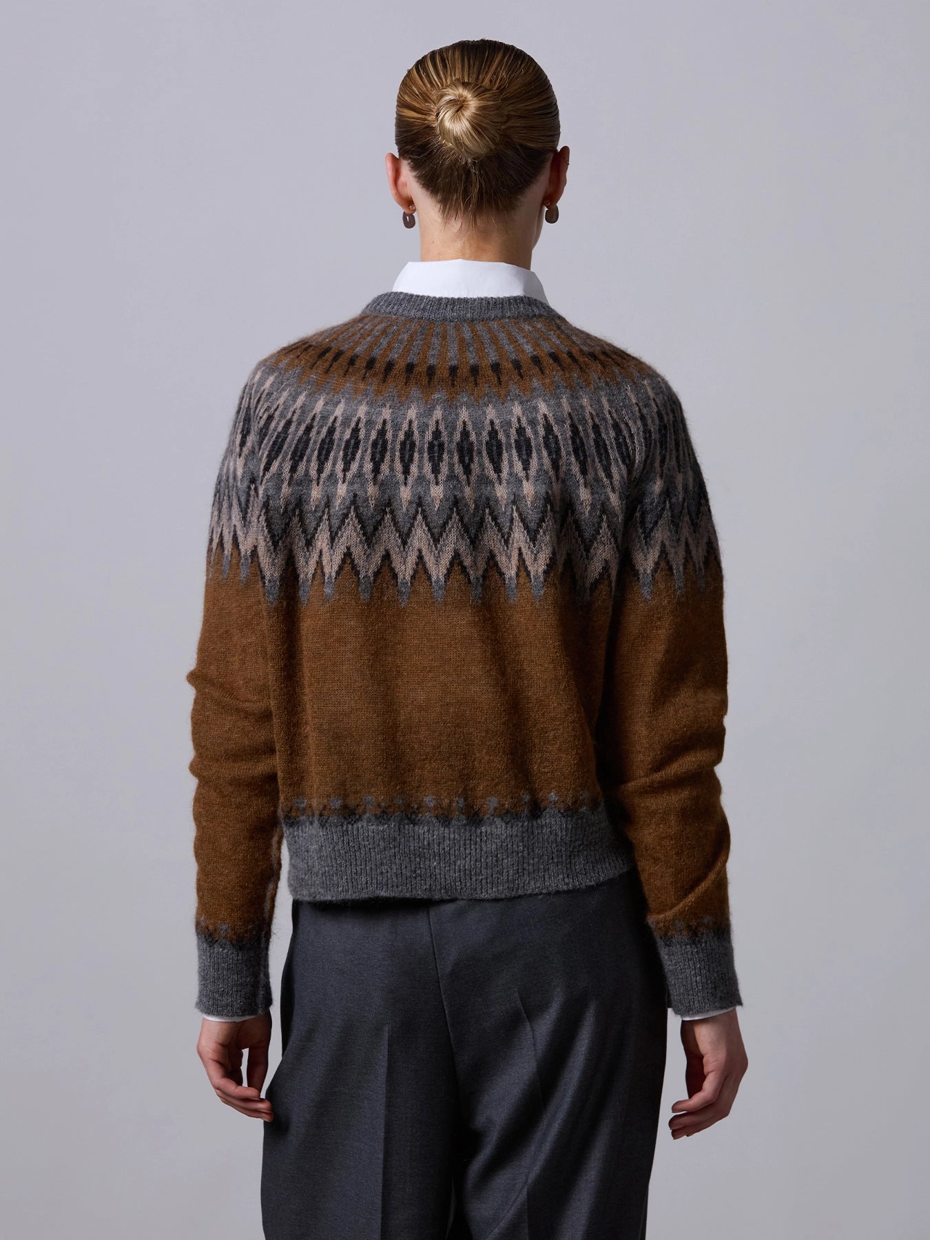Trui van het Italiaanse merk Roberto Collina. 68% alpaca, 22% polyamide, 10% wol. Kleur: Camello. Regular fit trui van een wolmix. De trui heeft geribde boorden aan de halslijn, zoom en manchetten en onderscheidt zich door een jacquardpatroon in Scandinavische stijl op het schouderstuk.