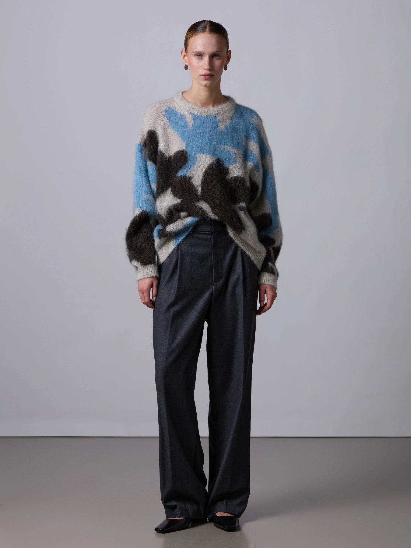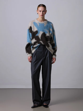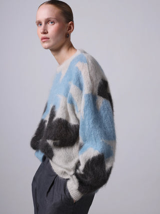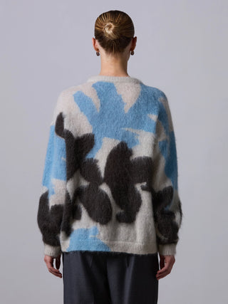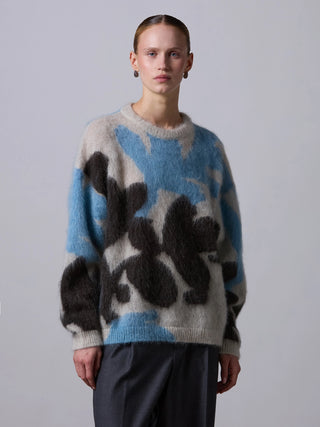 Trui van het Italiaanse merk Roberto Collina. 67% mohair, 28% polyamide, 5% wol. Kleur: Ghiaccio. Oversized trui gemaakt van een mix van wol en mohair met een pluizige textuur. De trui heeft verlaagde schouders en valt op door een abstract bloemenintarsia-motief, geïnspireerd op de Japanse kunst van Ikebana.