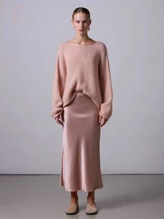 Trui van het Italiaanse merk Roberto Collina. 68% alpaca, 22% polyamide, 10% wol. Kleur: Rosa. Oversized breiwerk gemaakt van een mix van wol en alpaca met een zachte, lichtgewicht feel. Met verlaagde schouders, wijde mouwen en een strakke boothals. Afgewerkt met geribde manchetten.