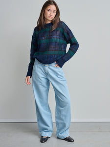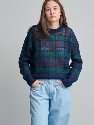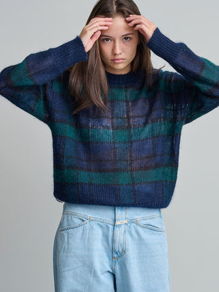 Trui van het Italiaanse merk Pomandère. 35% polyamide, 35% alpaca, 20% mohairwol, 10% wol. Kleur: 890. Trui met ronde hals in jacquard.