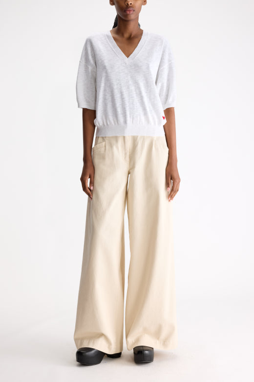 Trui van het Belgische merk Bellerose. 75% katoen, 25% linnen. Kleur: white. V-hals trui met korte mouwen.
